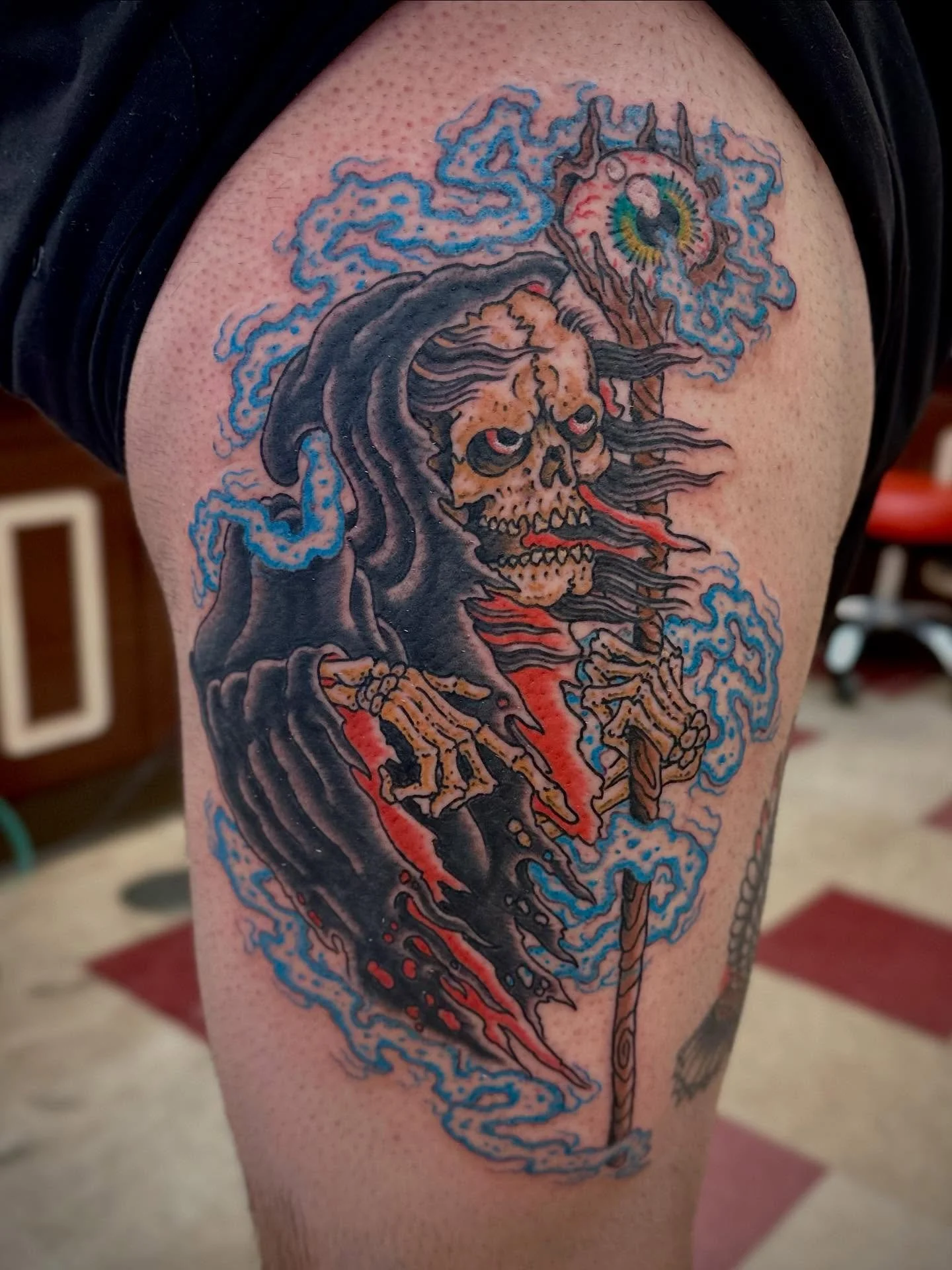 #ericmaaskesclassictattoo #fullerton #fullertontattooartists #thankyou #thatswhatsup #reaper #reapertattoo #magic #spookyghost