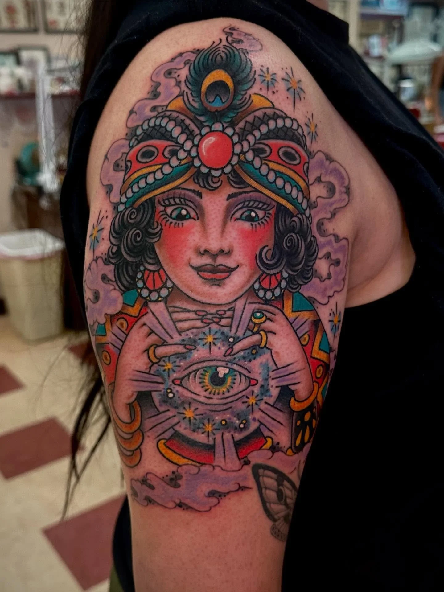 #ericmaaskesclassictattoo #fullerton #fullertontattooartists #thankyou #thatswhatsup #fortuneteller #pinup #pinuptattoo